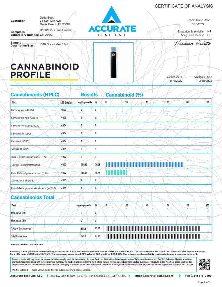 See below for Lab Analysis on Delta Boss D10 – Blue Dream Disposable