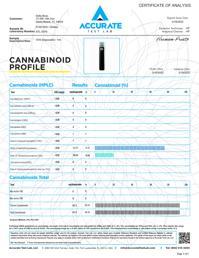 See below for Lab Analysis on Delta Boss D10 – Zkittlez Disposable