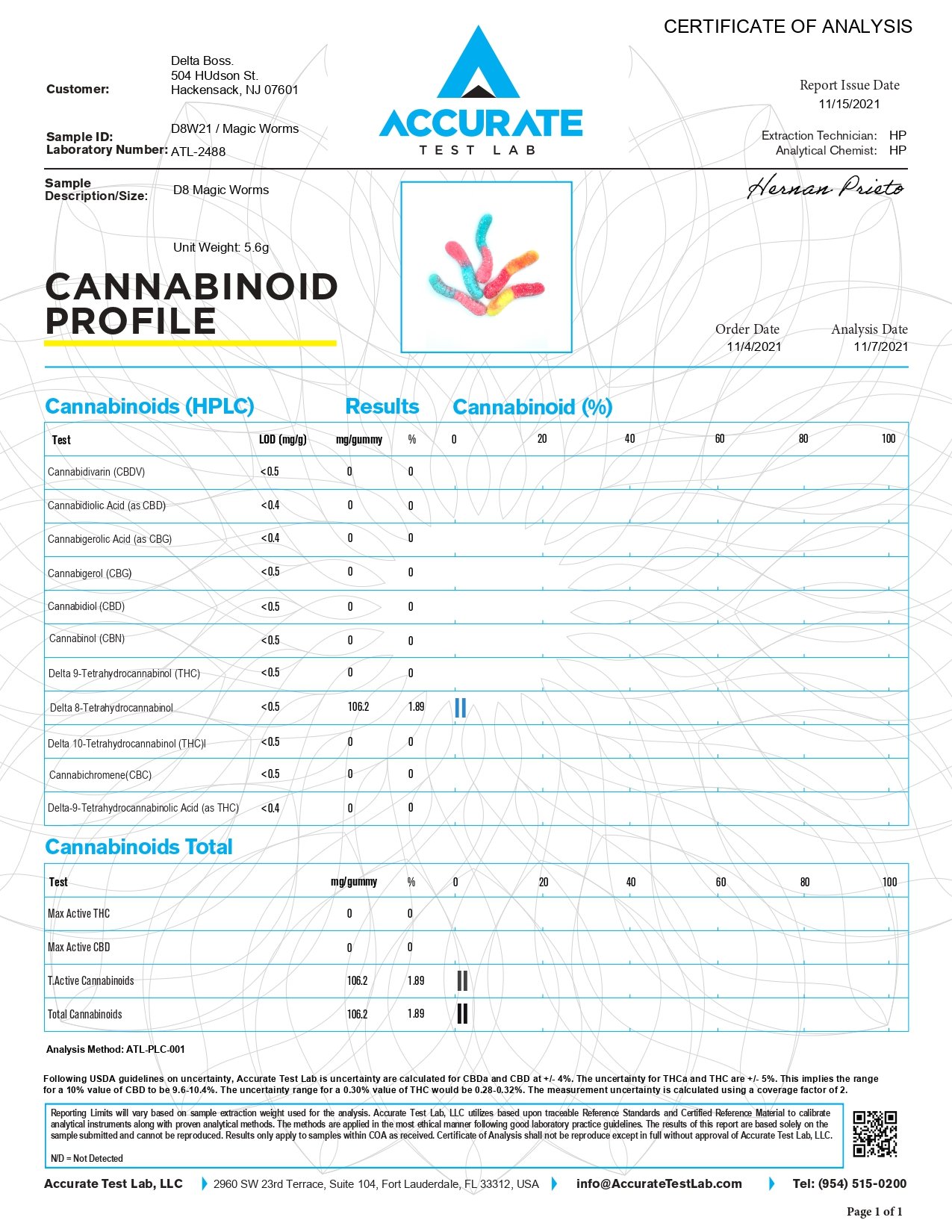 See below for Lab Analysis on all Delta Boss D8 Gummies – Magic Worms