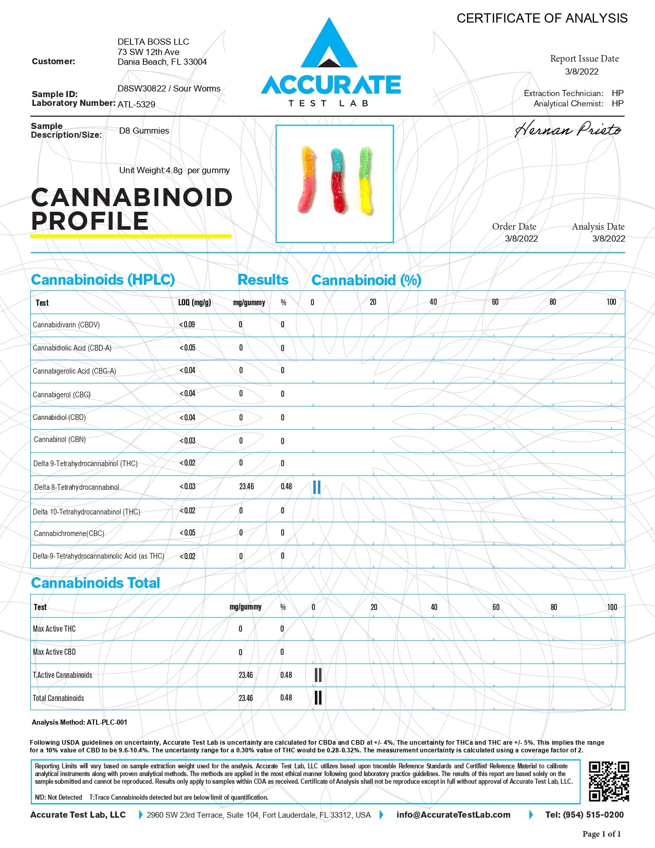 See below for Lab Analysis on Delta Boss D8 Gummies – Sour Worms