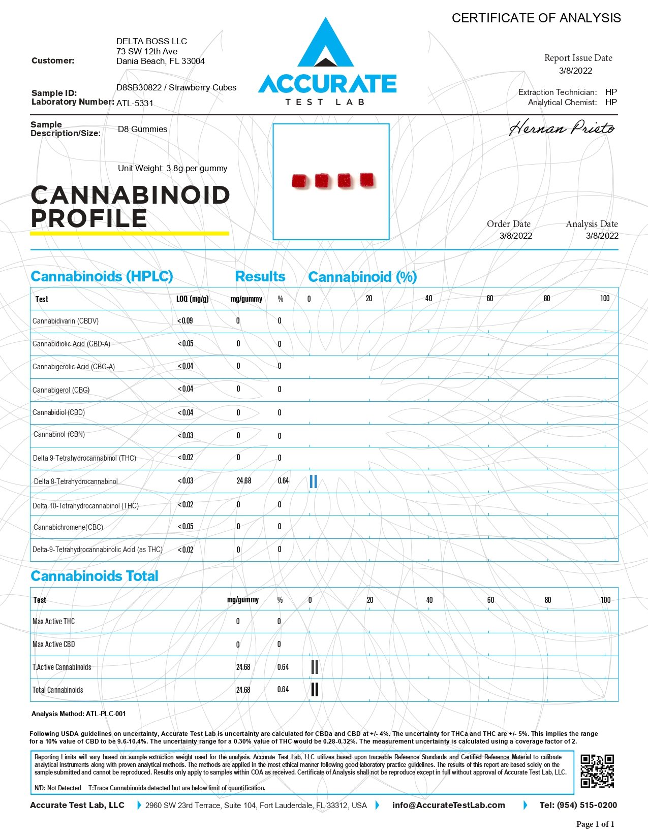 See below for Lab Analysis on Delta Boss D8 Gummies – Strawberry Cubes