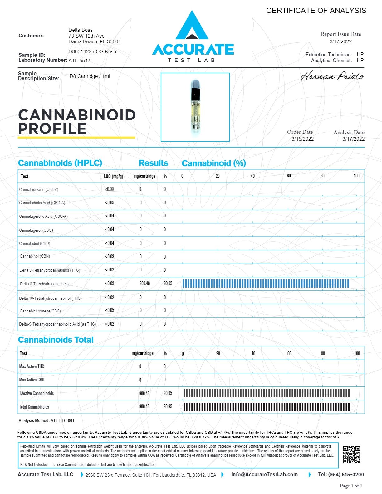 See below for Lab Analysis on Delta Boss D8 Vape Tank – OG Kush