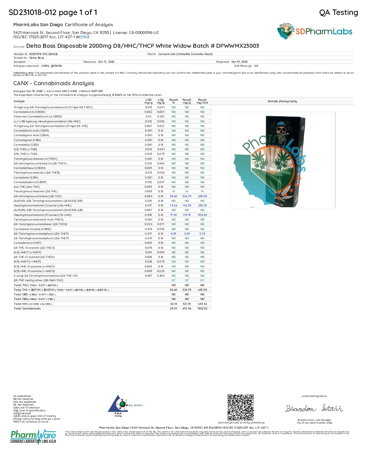 COAs – Delta Boss Crazy Pens D8/HHC/THCP – White Widow